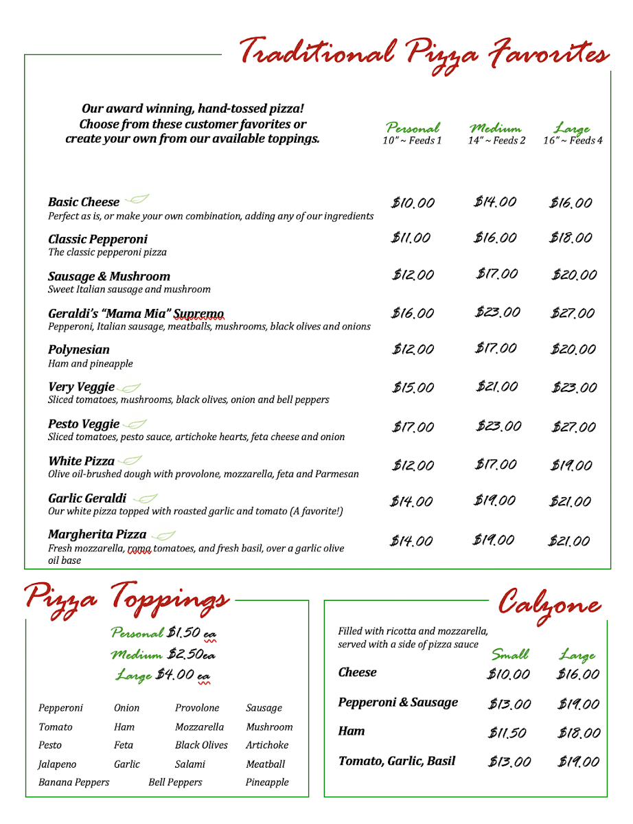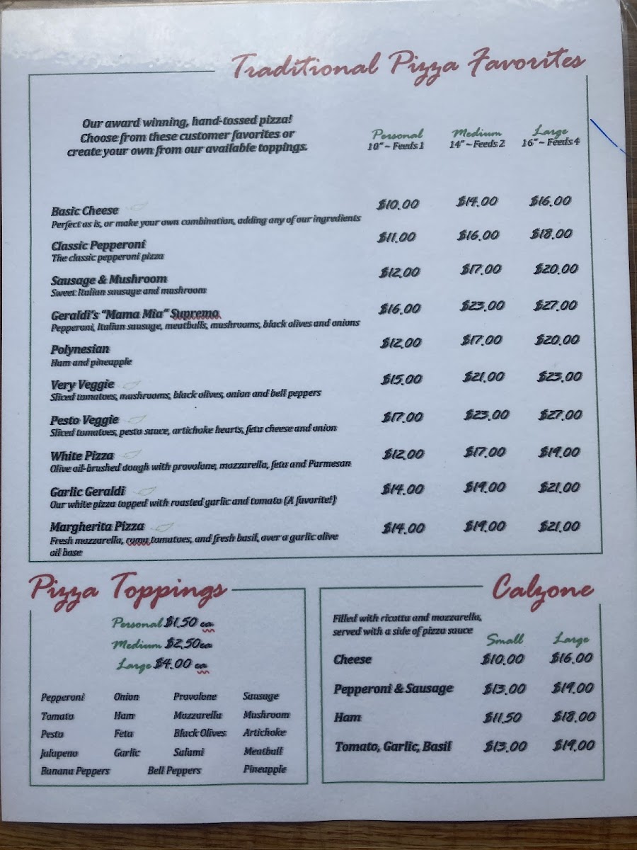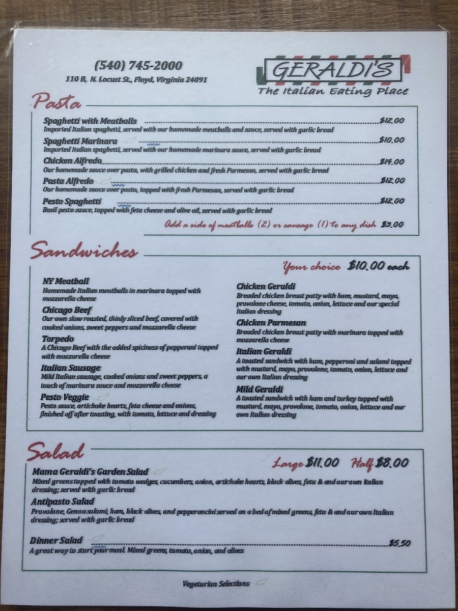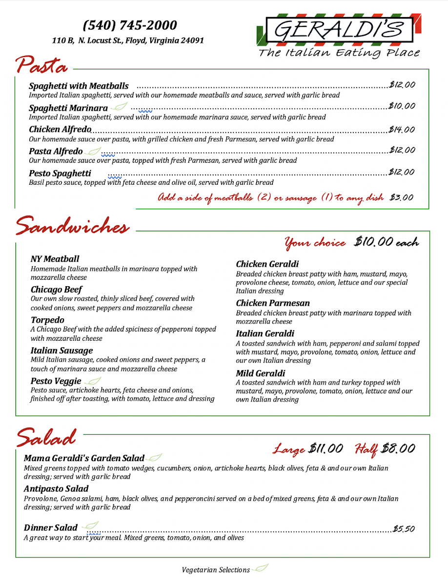 Located in the heart of Floyd, Virginia, Geraldi's Of Floyd, VA Menu offers a delightful selection of dishes that will make any meal feel like a special occasion. Whether you’re craving hearty comfort food or a fresh, flavorful dish, the menu is packed with options to suit every taste. From savory pastas to mouth-watering pizzas, each dish is crafted with care and attention to detail. The cozy atmosphere of this charming spot enhances the dining experience, making it perfect for a casual lunch or a dinner with friends and family. With locally sourced ingredients and a passion for great food, there's something for everyone to enjoy.